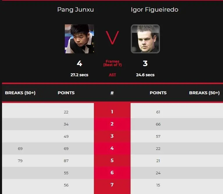 第四局,庞俊旭在连输三局之后,终于强势反弹,他打出单杆69分,69-22挽救第一个赛点,比分追成3-1。第五局,庞俊旭持续发力,菲格雷多继续被抑制。这一局,庞俊旭又打出单杆79分,87-21挽救第二个赛点,比分迫近为3-2。