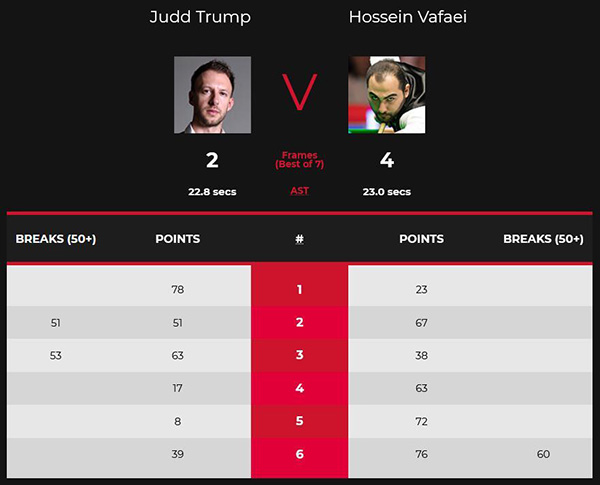 第五局,瓦菲打进红球,没有机会强行打黑球犯规;特鲁姆普打进红球防守,瓦菲长台上手单杆43分,特鲁姆普没有解到,随后瓦菲两次上手单杆6分单杆18分,瓦菲72-8拿下。瓦菲3-2赛点。第六局,瓦菲单杆6分防守,瓦菲翻袋上手,单杆60分,特鲁姆普拼进攻不进,瓦菲单杆7分,以73-0超14分,特鲁姆普继续努力追回24分,瓦菲没有解到,瓦菲最后一颗红球送袋口,特鲁姆普解进了红球,单杆5分,以33-73落后,台面只有27分,瓦菲没有解到,特鲁姆普打进黄球,瓦菲解进绿球拿下比赛!