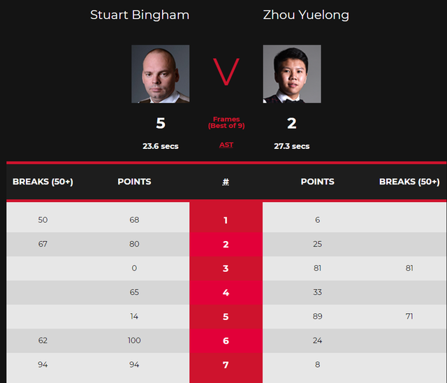 第一局,两人上来就是各种失误,宾汉姆抓住机会单杆50分,68-6先下一城。第二局,周跃龙仅拿到25分,宾汉姆单杆67分、多杆上手80-25再次拿下,2-0领先。第三局,宾汉姆失误留下袋口球,周跃龙单杆81分一杆制胜追回一局。第四局,周跃龙又出现简单失误,宾汉姆多杆上手65-33再下一城,3-1领先进入中场休息。