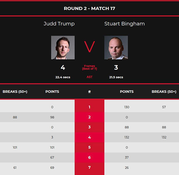 第四局,特鲁姆普开局率先上手得分,3-0后断掉。宾汉姆上手之后手感火热,他轰出单杆132分,132-3再胜一局,比分优势扩大到3-1,并率先赢得赛点。第五局,绝境之下的特鲁姆普开启逆袭模式,他的单杆101分挽救一个赛点,比分追成3-2。第六局,特鲁姆普以67-37挽救第二个赛点,比分追成3-3,双方回到同一起跑线。第七局,特鲁姆普单杆61分制胜,69-26完成逆袭,4-3有惊无险晋级!
