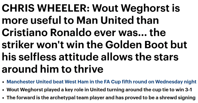 除了桃色风波之外,C罗还被名嘴批评,这是美职棒评论员克里斯-惠勒在点评C罗、韦霍斯特和曼联的时候,直言韦霍斯特更加适合现在的曼联,即便是在球队确保胜局的伤停补时期间依旧不断给对手施压。他对比韦霍斯特与C罗,称:“总感觉这位葡萄牙超级巨星总在为自己而活,韦霍斯特则相反,典型的团队球员,尽管能力比C罗更有限。他的付出让拉什福德和加纳乔更加大放异彩。”