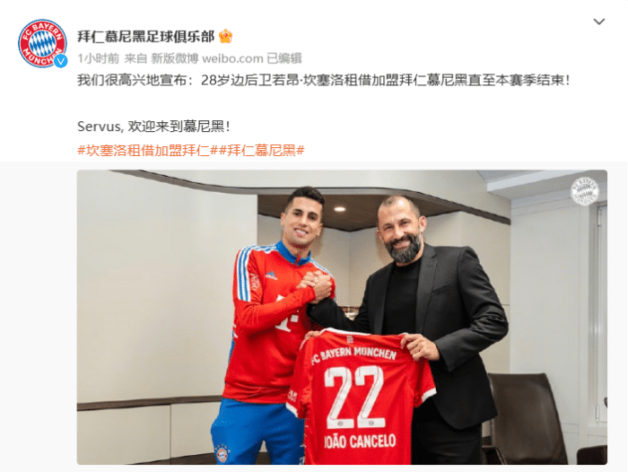 我们很高兴地宣布:28岁边后卫若昂·坎塞洛租借加盟拜仁慕尼黑直至本赛季结束!