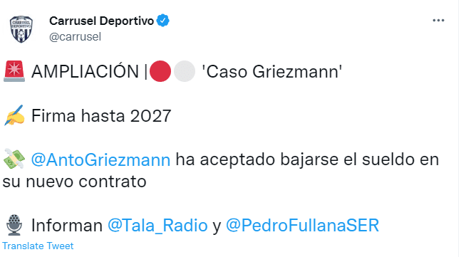 Relevo表示,双方很快就会敲定买断协议,买断费为2000万欧元+200万欧元奖金,格列兹曼将大幅降薪至700万欧元,而塞尔电台则称,格列兹曼将与马竞签约至2027年。