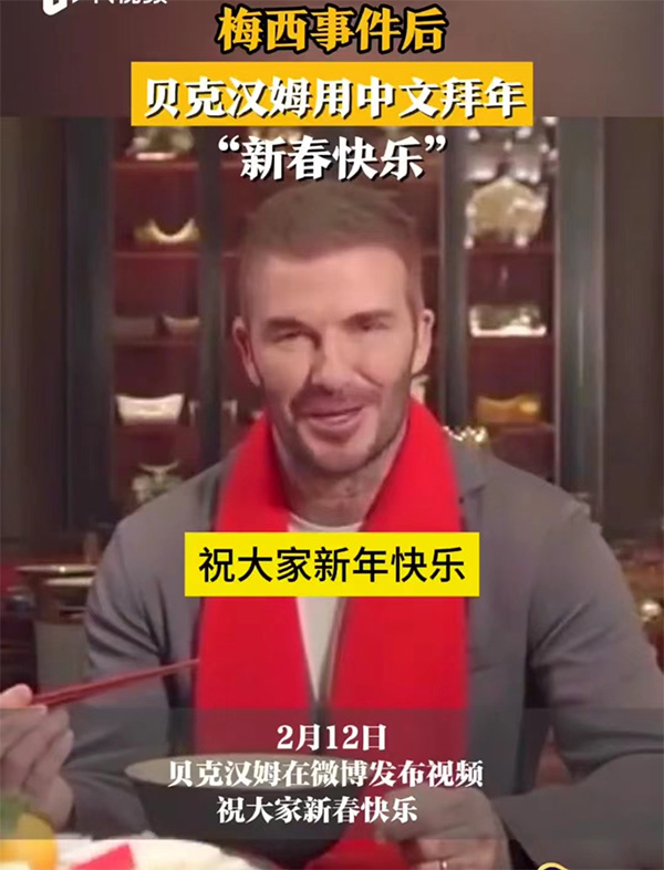 其实是贝克汉姆的举动,在中国春节来到的时候,贝克汉姆也是特意录制了视频,并且用中英文喊话“新春快乐”向中国球迷拜年,从贝克汉姆的举动上,我们能够清晰的感受到贝克汉姆并不愿意被卷入到这一场梅西拒绝上场的风暴中,贝克汉姆并不想失去中国市场,哪怕他主导的迈阿密国际以后很难敲开我们的大门,贝克汉姆也是选择了丢车保帅,保住自己的个人IP,这或许也是事情进行到现在,贝克汉姆没有替梅西出头发声的原因。