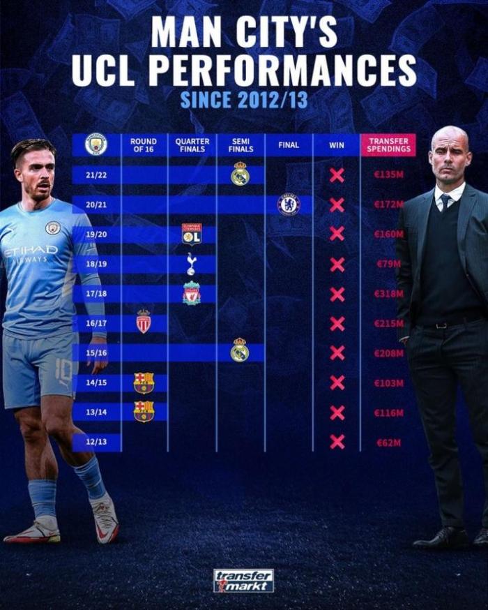 10年来曼城豪掷15.68亿欧元买人,3次止步八强,2次止步半决赛,1次饮恨决赛,至今无缘梦寐以求的大耳朵杯。