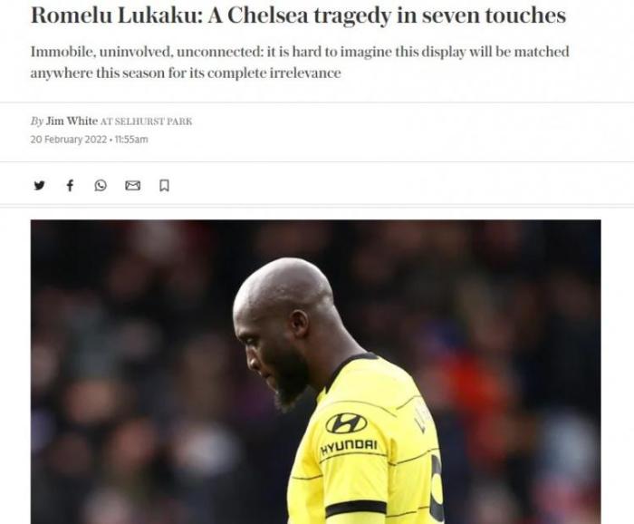 文章的具体标题为“卢卡库:7次触球的切尔西悲剧”,并且在文章中写道:昨晚的卢卡库“不动、不参与、无联系”。