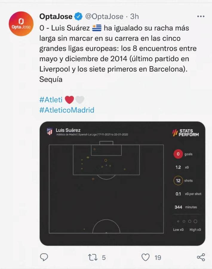 据Opta统计,苏亚雷斯在西甲比赛中已经连续8场没有收获进球,追平了自己在五大联赛中最长时间的进球荒。上一次连续8场未进球还要追溯到他在利物浦的最后一场英超联赛以及在巴塞罗那的前7场比赛。