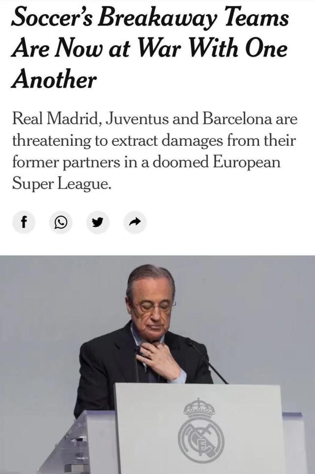 来源:24直播网05-08 12:0724直播网讯 北京时间5月8日凌晨,来自《纽约时报》体育专栏记者Tariq Panja的报道,上月组建欧超联赛的12家俱乐部关系已经走向破裂,甚至“反目成仇”。其中仍然留在欧超的三家豪门皇家马德里、尤文图斯和巴塞罗那,依然拒绝让这个项目夭折。皇萨文三队还在一封公开信中表示,如果有任何球队按计划退出联盟,他们将对其他俱乐部采取法律行动,收取数百万美元的罚款。
