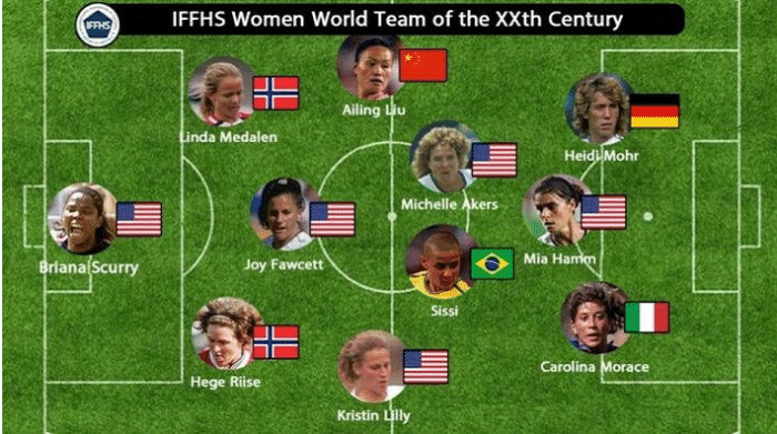 而女足最佳阵容也是343阵容,门将位置上是前美国国脚斯库里;后卫分别是前挪威国脚里瑟、前美国国脚福西特和前挪威国脚梅达伦;中场分别是前美国国脚莉莉、前巴西国脚茜茜、前美国国脚阿科尔斯和咱们的国脚刘爱玲,前锋分别是前意大利国脚莫拉切、前美国国脚哈姆和前德国国脚摩尔。而这个阵容中,孙雯落选了,不得不说这真的令人感到遗憾。