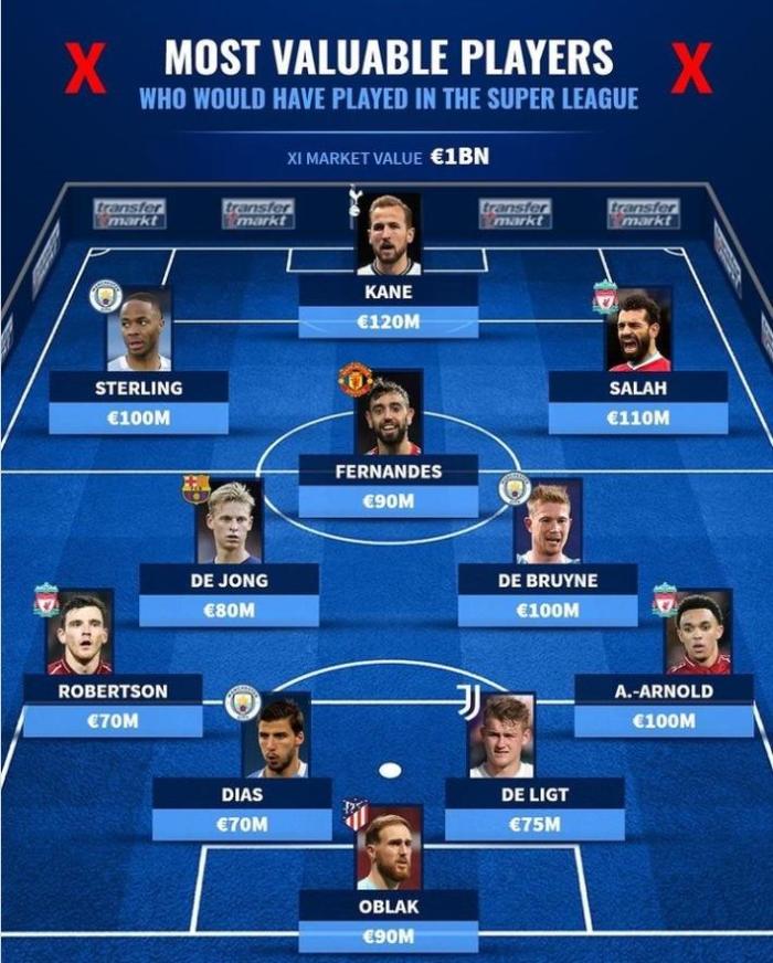 24直播网讯今日,德国转会市场盘点了欧超联赛最贵阵容,利物浦三人入选最多,阵容总价达到10亿欧元。