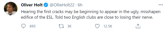 24直播网讯 据《每日邮报》首席体育记者奥利弗-霍尔特报道,欧洲超级联赛内部可能已经出现裂痕,有两支英格兰俱乐部快要失去勇气了。