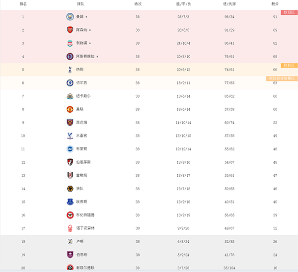 来源:24直播网05-20 15:5724直播网讯 北京时间5月20日,英超第38轮也是最后一轮结束争夺,最终曼城夺冠,力压阿森纳,利物浦获得季军,曼联无缘欧战,森林队压哨保级成功,降级的队伍已经出炉。接下来我们一起来看看英超最终排名: