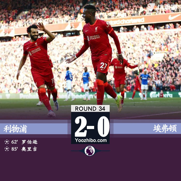 24直播网4月25日讯 北京时间4月24日23时30分,2021-2022赛季英超第34轮上演一场默西塞德德比战,利物浦主场迎战埃弗顿。上半场双方均无建树,利物浦半场0-0战平埃弗顿。下半场,萨拉赫助攻罗伯逊首开纪录,替补登场的奥里吉破门锁定胜局。最终利物浦主场2-0击败埃弗顿,取得联赛两连胜。此役战罢,利物浦继续排名第二,依旧落后领头羊曼城1分。