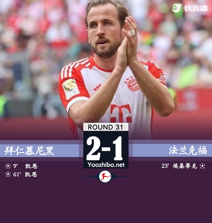 24直播网讯:北京时间4月27日21:30,德甲第31轮,拜仁主场迎战法兰克福。上半场,莱默尔一条龙送出助攻后伤退,凯恩破门,埃基蒂克远射扳平;下半场,穆勒造点,凯恩点射梅开二度。最终,拜仁2-1击败法兰克福,积69分继续位列积分榜第二位,球队下周中将迎来与皇马的欧冠半决赛首回合赛事,法兰克福积45分排在积分榜第6位。由于多特本轮输球,拜仁领先多特已达12分,锁定下赛季欧冠资格。