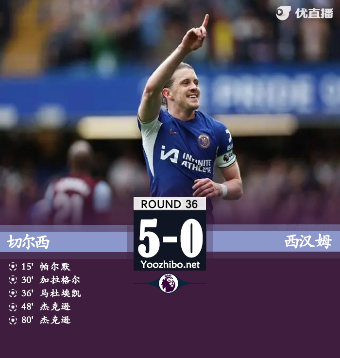 24直播网讯:北京时间5月5日21时,英超第36轮,切尔西主场迎战西汉姆联。上半场,帕尔默破门为切尔西首开纪录,加拉格尔和马杜埃凯连入两球扩大比分优势,半场双方击中三次门框,加拉格尔一次,鲍文两次!半场战罢,切尔西暂3-0西汉姆联;下半场,杰克逊连入两球上演梅开二度,恩昆库替补出场,鲍文本场第三次击中门框!全场比赛结束,切尔西5-0西汉姆联!