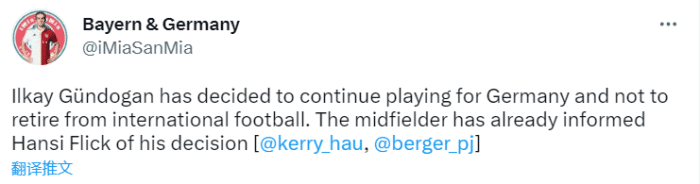该记者表示,京多安不会从德国国家队退役,他会继续为国效力,并且已经将这个决定告知了主教练弗里克。