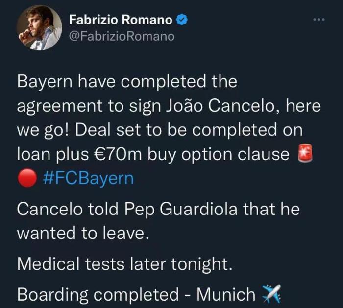 坎塞洛告诉瓜迪奥拉他想要离队,球员今晚接受拜仁体检。