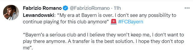 对此莱万回答:“这是一个好问题,我不喜欢现在的情况,我能确定的是我的拜仁生涯已经结束,我没有看到任何为这支俱乐部继续踢球的可能,让我们看看未来两周会发生什么吧。”