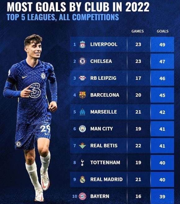 24直播网04月15日讯 德国转会市场统计了2022年以来五大联赛球队的进球排名,利物浦49球力压切尔西排名第一。