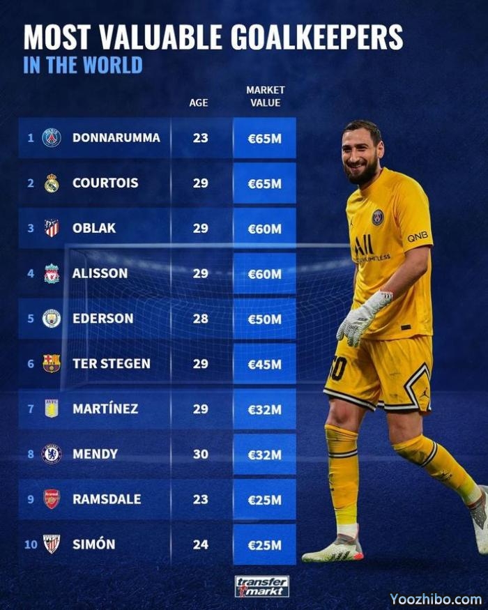 多纳鲁马和库尔图瓦都是6500万欧,随后是6000万的奥布拉克和阿利松。前10名的门将中,英超占了5席。