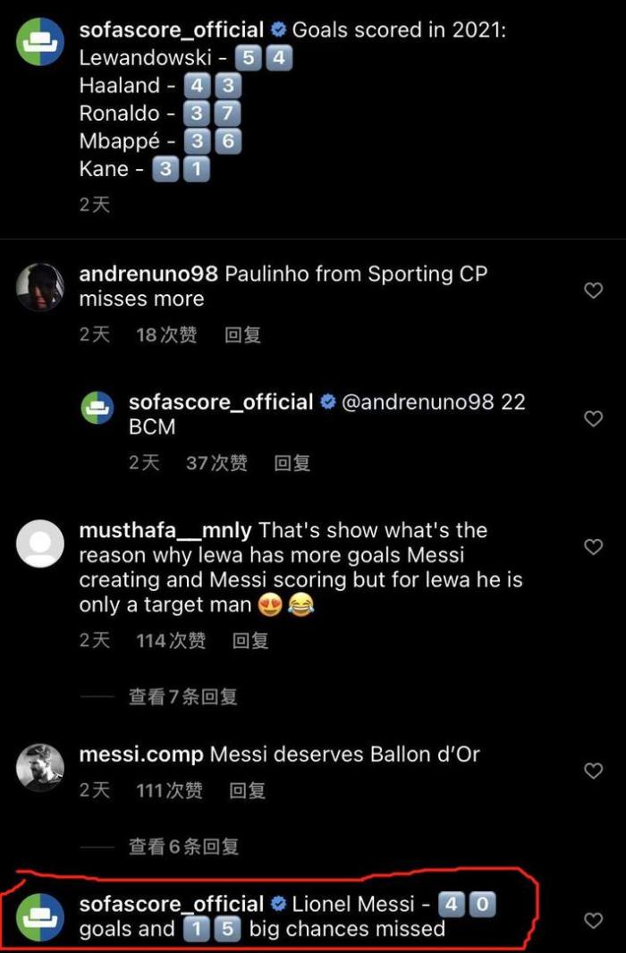 巴黎球星梅西未在榜单前五,随后SofaScore在评论中表示,梅西错失绝佳机会为15次,同时进球数为40粒。