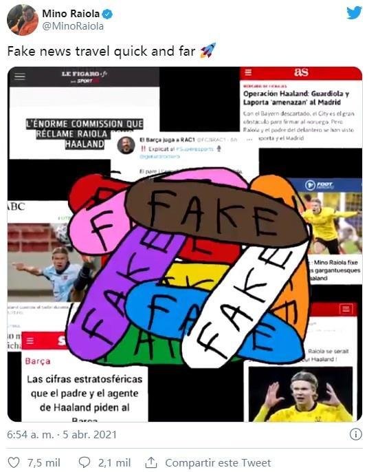 而此前,拉伊奥拉在社交媒体中贴出了多家媒体相关报道的内容,并在中间打上了“FAKE”的标记。同时,拉伊奥拉配文称:“虚假新闻传播得可真是又快又远!”