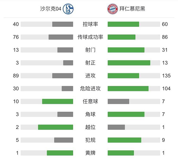 全场比赛结束,最终,沙尔克0-4不敌拜仁慕尼黑。