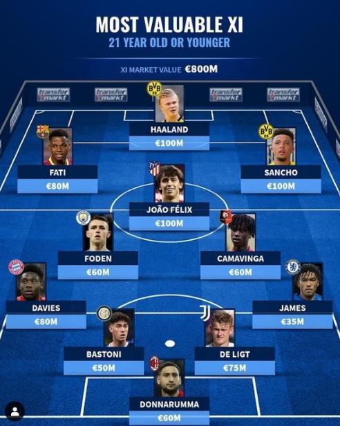 U21最贵阵容:哈兰德桑乔、菲利克斯亿元俱乐部