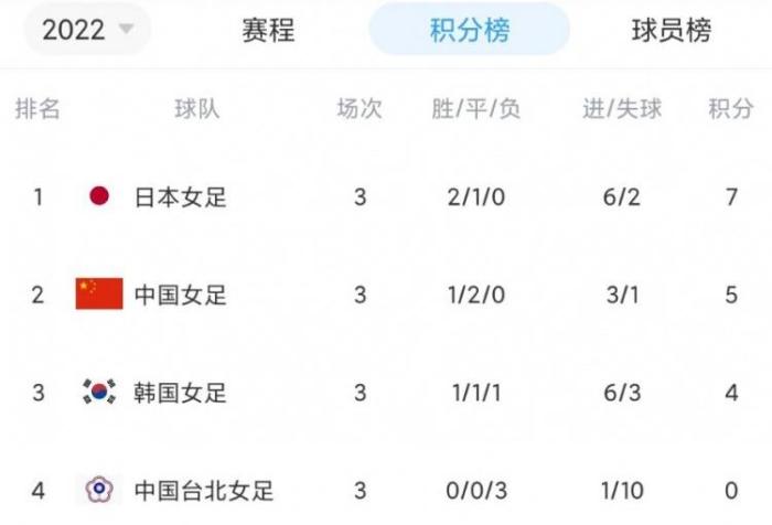 东亚杯完整积分榜上,日本队两胜一平,积7分夺冠,中国女足一胜两平,积5分位列第二。