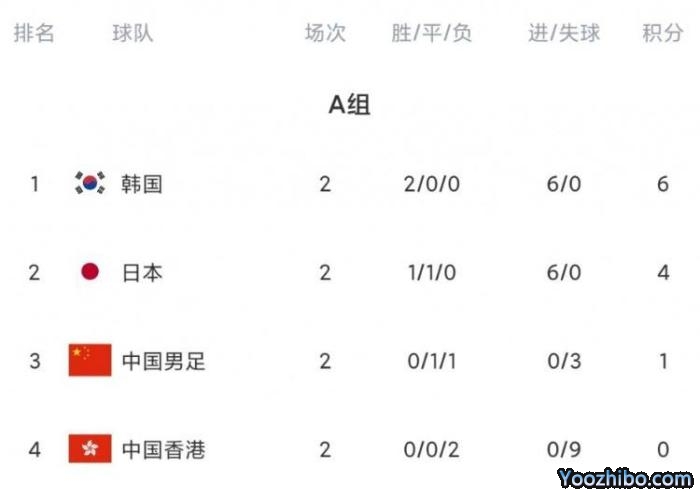 在目前东亚杯积分榜上,韩国男足两连胜位居榜首,日本队一胜一平第二,中国男足一平一负第三,中国香港两连败垫底。