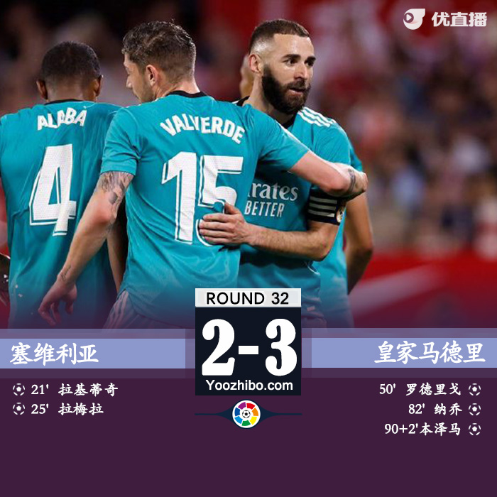 24直播网4月18日讯 北京时间4月18日凌晨3点整,2021-22赛季西甲第32轮焦点战在皮斯胡安球场展开角逐,皇家马德里客场挑战塞维利亚。上半场拉基蒂奇任意球首开纪录,拉梅拉扩大比分,马夏尔伤退,下半场纳乔扳平比分,罗德里戈替补传射,本泽马补时绝杀。最终皇家马德里客场3-2逆转塞维利亚,积分榜方面,皇马积75分,以15优势领跑,塞维利亚积60分位列第三。