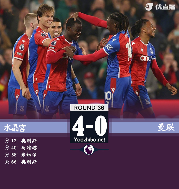 24直播网讯:北京时间5月7日,2023-24赛季英超联赛第36轮,曼联客战水晶宫。上半场奥利斯进球,卡塞米罗头球破门,但因霍伊伦冲撞门将被判无效,随后马特塔为水晶宫再下一城,上半场曼联暂0-2水晶宫;下半场卡塞米罗破门但越位在先,米切尔破门,奥利斯再进一球,最终水晶宫4-0曼联,红魔近6轮比赛只赢1场。