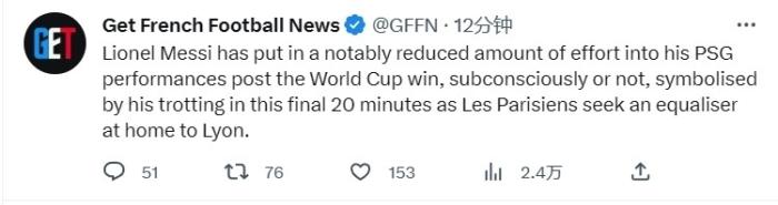 赛后,法国著名足球媒体Get French Football News更是毫不客气批评梅西道:“梅西赢得世界杯后在大巴黎的出力明显减少了,不管他是不是有意的,这从他最后20分钟慢跑(trotting)可以体现出来。要知道球队正在为扳平比分而努力”。不出意外,当大巴黎输球后,梅西再次成为法媒众矢之的怒批的“背锅侠”。