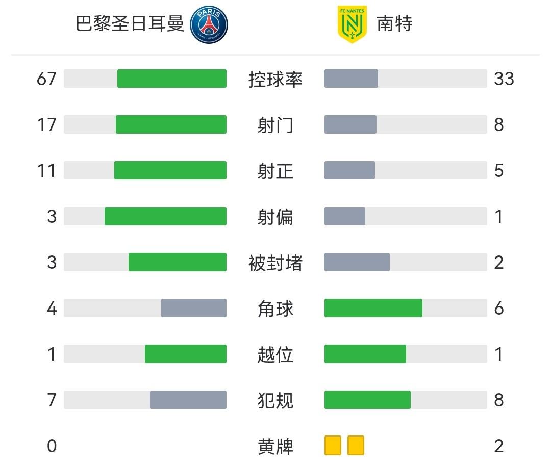 最终巴黎主场4-2击败南特,暂以11分优势领跑法甲。