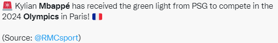 RMC体育透露,姆巴佩在续约时提到的一个要求就是,如果自己被国奥队选中,那么巴黎圣日耳曼必须放他去参加2024年的巴黎奥运会,而俱乐部同意了他的要求。