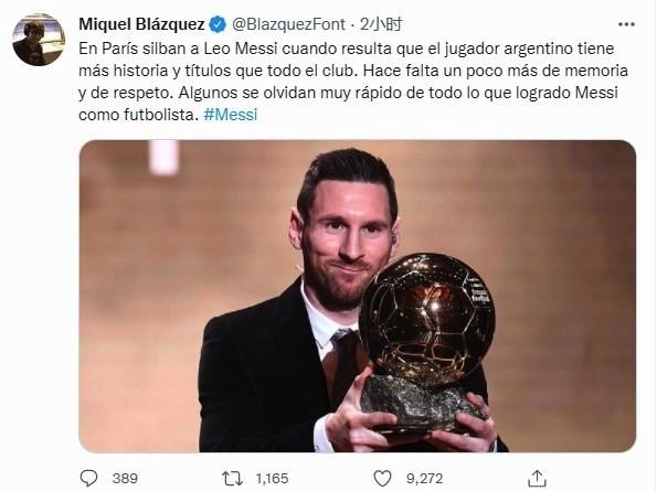 西班牙记者Miquel Blazquez发声力挺梅西:“在巴黎,梅西遭受满场嘘声,但事实上这位阿根廷的历史和冠军数比整个俱乐部都多。我们需要更多的记忆和尊重,有些人很快就忘记了梅西作为一名足球运动员所取得的一切成就。”名记Alfredo Martínez更是直言,巴黎圣日耳曼配不上梅西!