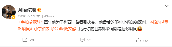 从韩聪的社交媒体,我们可以看出他是梅西的铁杆粉丝。
