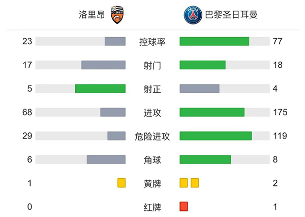 全场比赛结束,洛里昂1-1巴黎圣日耳曼。