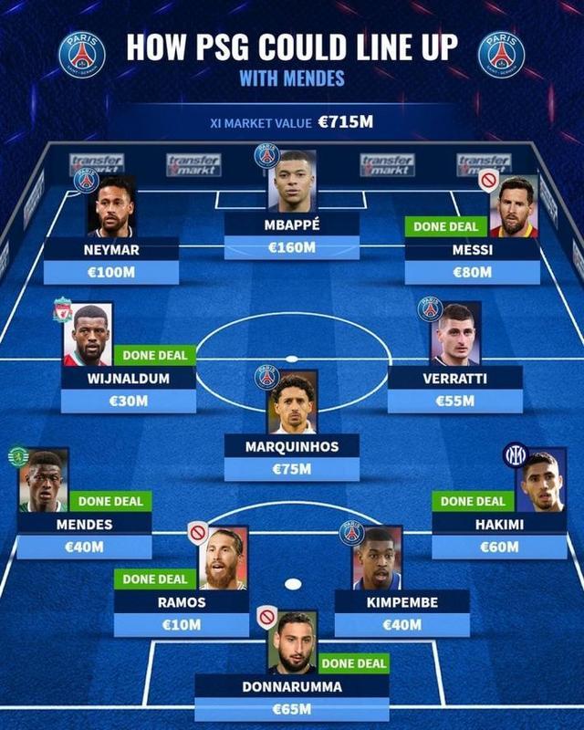 德转预测的巴黎首发:(球员身价)