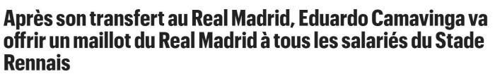 18岁的法国小将卡马文加在今夏的转会窗压哨加盟皇马,在成为银河战舰的一员后,卡马文加也不忘感谢老东家雷恩,他向雷恩的全体工作人员赠送了皇马球衣,共计166件。