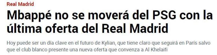 《马卡报》还称,如果皇马只能提供这个报价,那巴黎方面不会进行谈判,姆巴佩越来越有可能在本赛季留队。