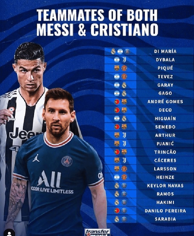 梅西转会巴黎后,和梅西、C罗都做过队友的球员增至21人!