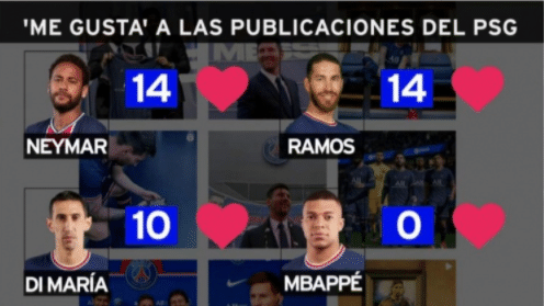 这是根据《西班牙六台》的统计显示,大巴黎官方发布了20条梅西动态,其中梅西好友内马尔和新援拉莫斯点赞了14条,梅西国家队和俱乐部双料队友迪马利亚点赞了10条,姆巴佩是尴尬的0条。
