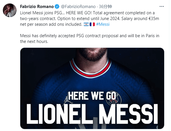 此前双方因为肖像权问题没有谈妥,不过罗马诺发文Herewego,称梅西和巴黎已经完全谈妥,他将签下一份2+1的合同,并在接下来几小时飞抵巴黎。有报道称他将在巴黎身穿30号球衣。