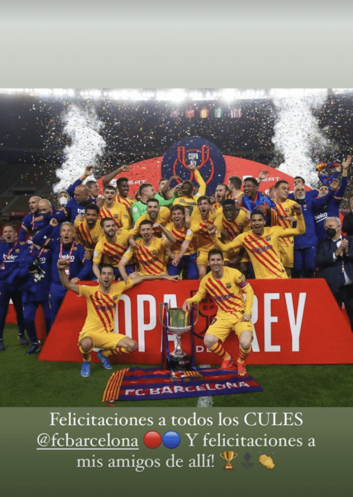 他晒出了巴萨全队捧杯时刻的照片,配文道:“恭喜所有巴萨球迷们,也为我在巴萨的朋友们送去祝福!”