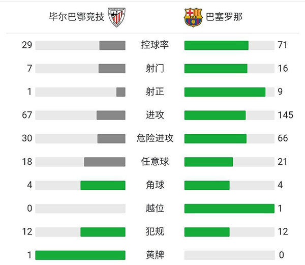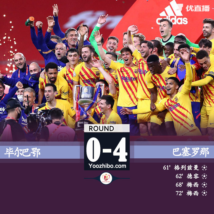 全场比赛结束,巴萨4-0横扫毕尔巴鄂夺冠。