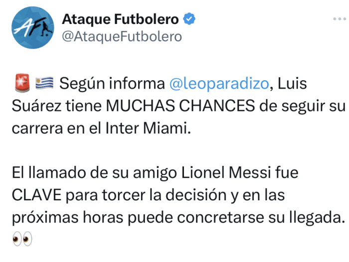 此前,苏亚雷斯在接受采访时曾表示,自己暂时没有考虑离开格雷米奥。但在梅西亲自打电话给他后,这成为了扭转决定的关键,苏亚雷斯在未来几小时就可能做最终决定。