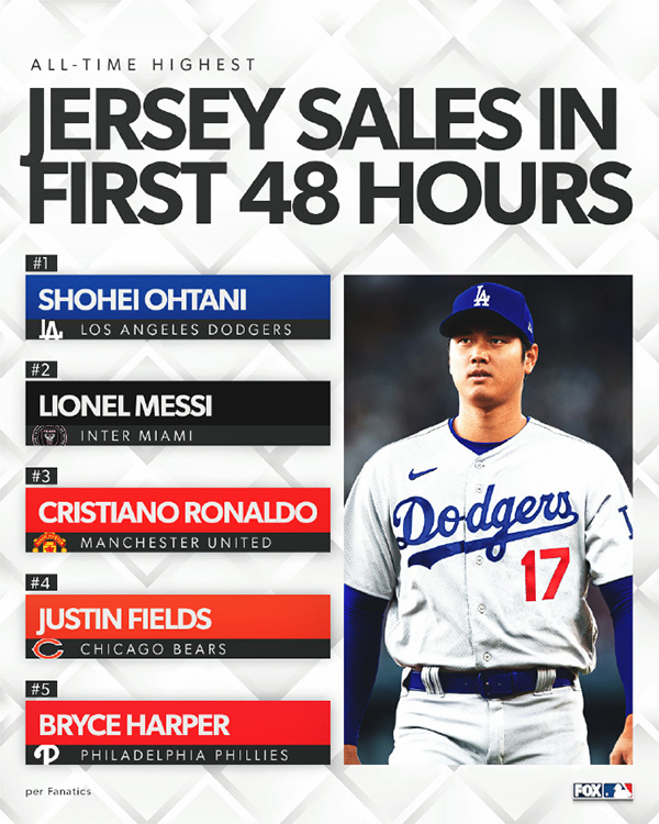 大谷翔平再创历史!球衣48小时内销量超梅西C罗,打破纪录