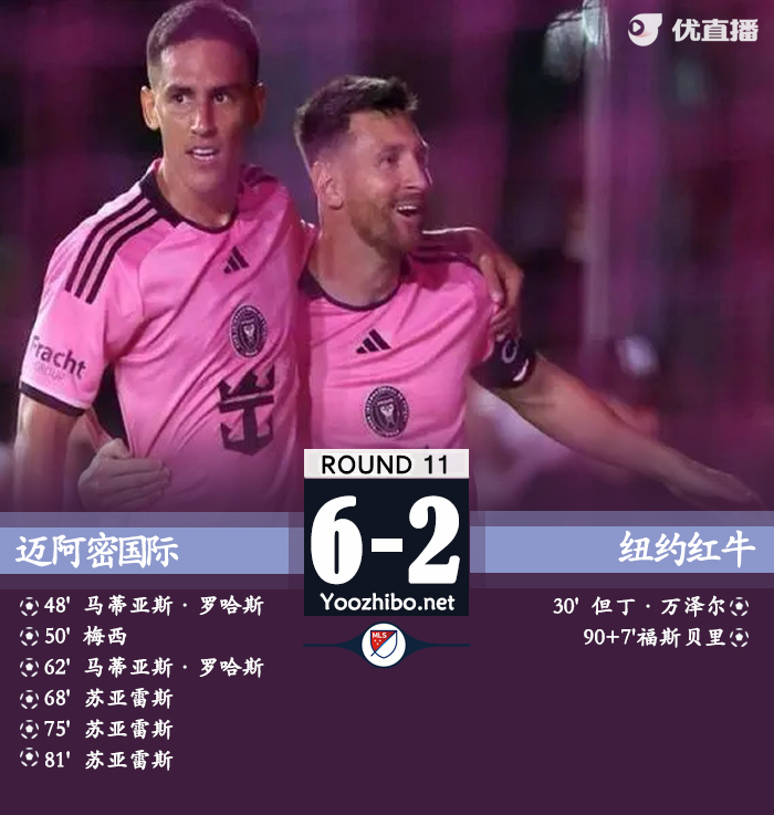 最终迈阿密国际主场6-2纽约红牛。