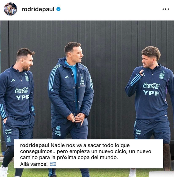 有着梅西保镖之称的德保罗在社交媒体上晒出自己的和梅西等人一起训练的画面,只见梅西双手插兜,德保罗配文:“没有人能夺走我们所取得的一切......新的周期开始了,下一届世界杯让我们开始吧!”